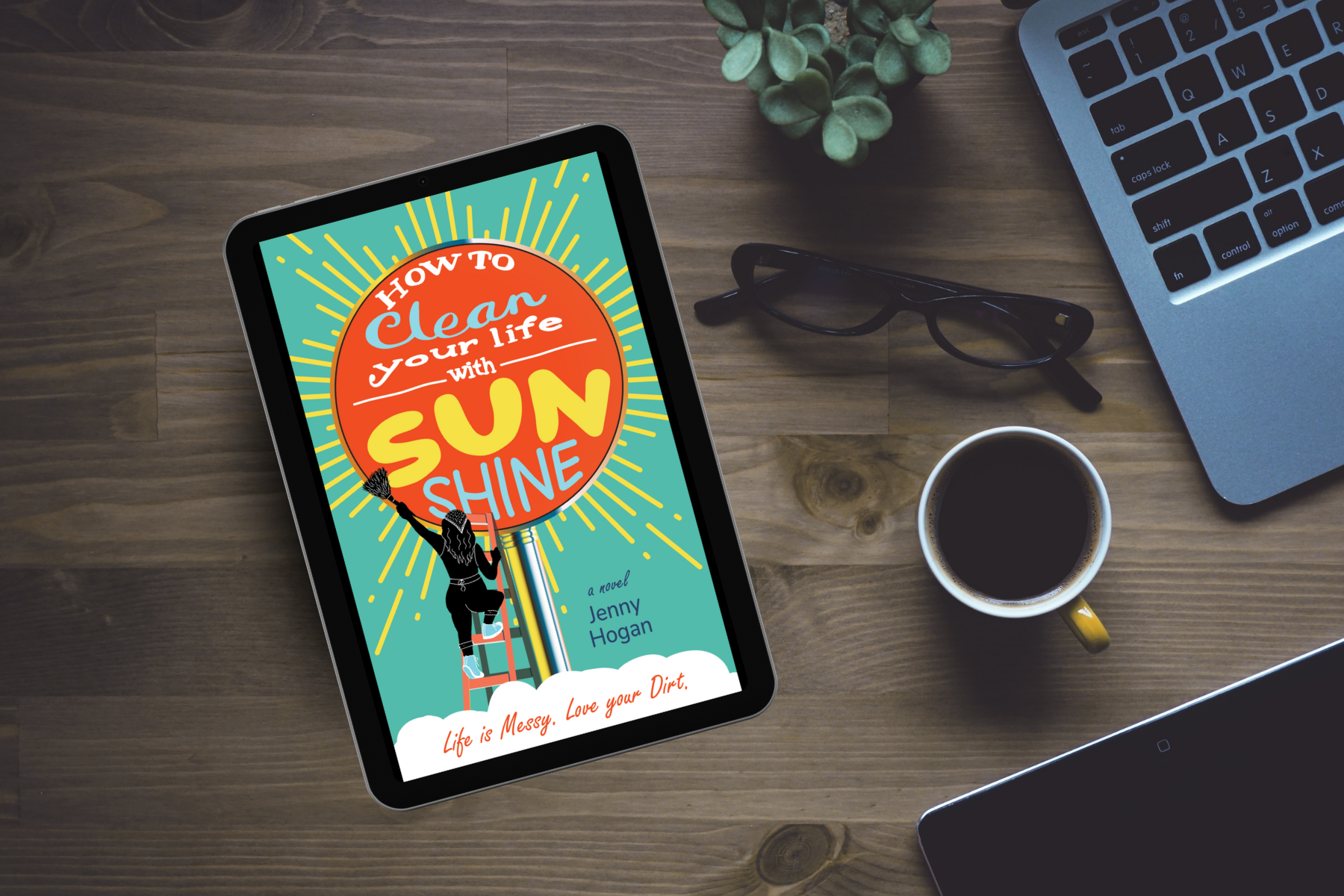 • an ipad on a desk that features the book cover for "How To Clean Your Life With Sunshine" a novel by Jenny Hogan